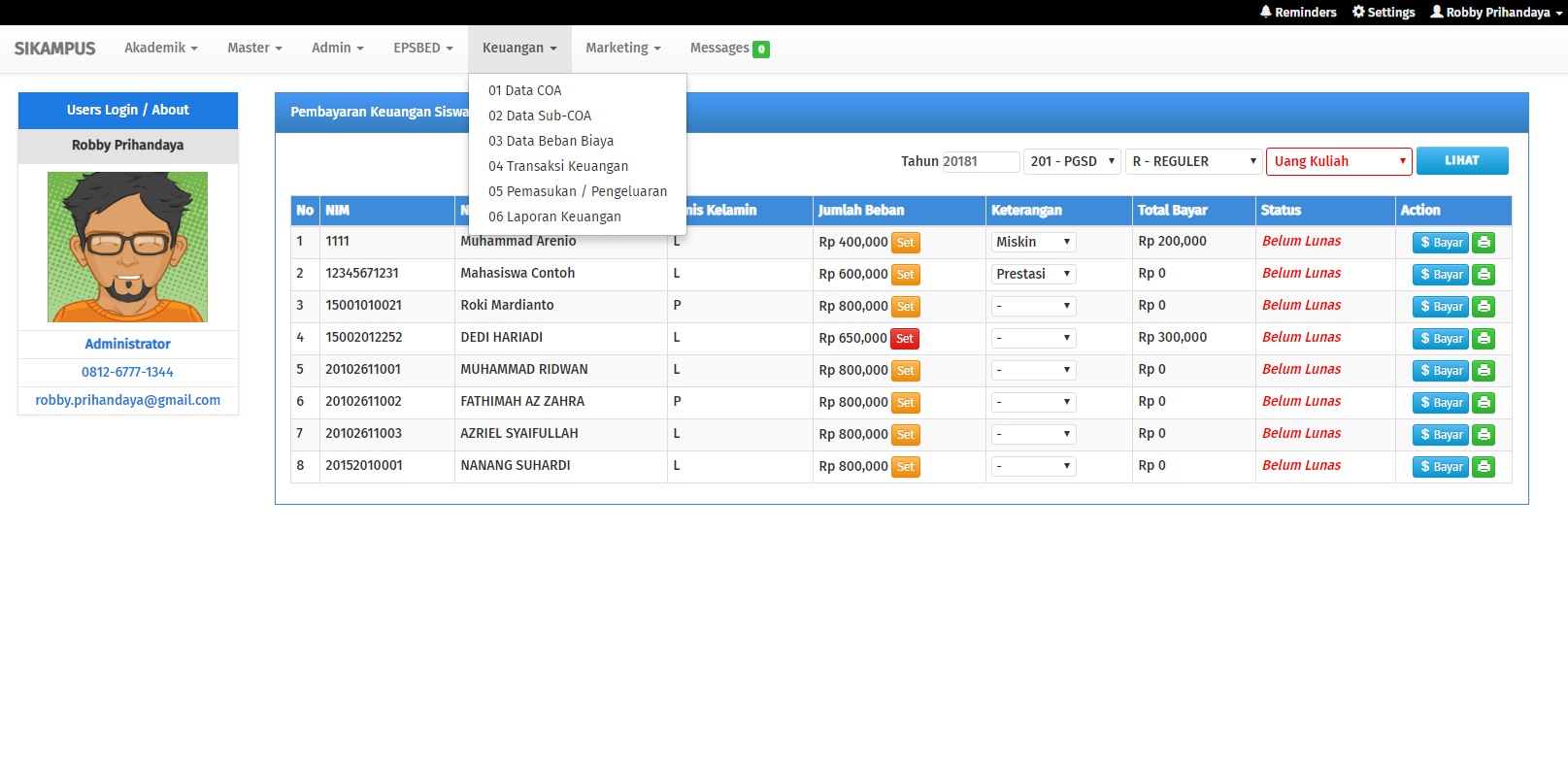 Sistem informasi akademik adalah suatu sistem yang dibangun untuk mengelola data-data akademik, sehingga memberikan kemudahan kepada pengguna dalam kegiatan administrasi akademik kampus secara online. Sistem Informasi Akademik ini dikembangkan oleh Bpk. Roki Aditama yang sudah berpengalaman dalam mengembangkan sistem informasi akademik dan pernah menulis buku Best Seller di Lokomedia dengan judul Sistem Informasi Akademik Kampus Berbasis Web dengan PHP.